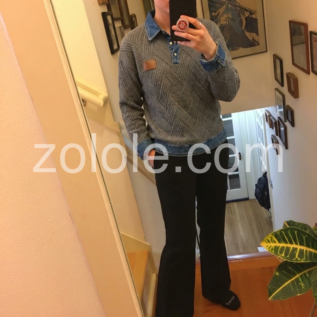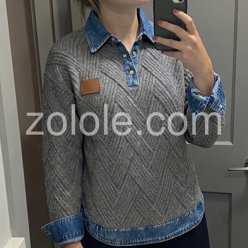 Grey Herringbone Knit Denim Collar Sweater