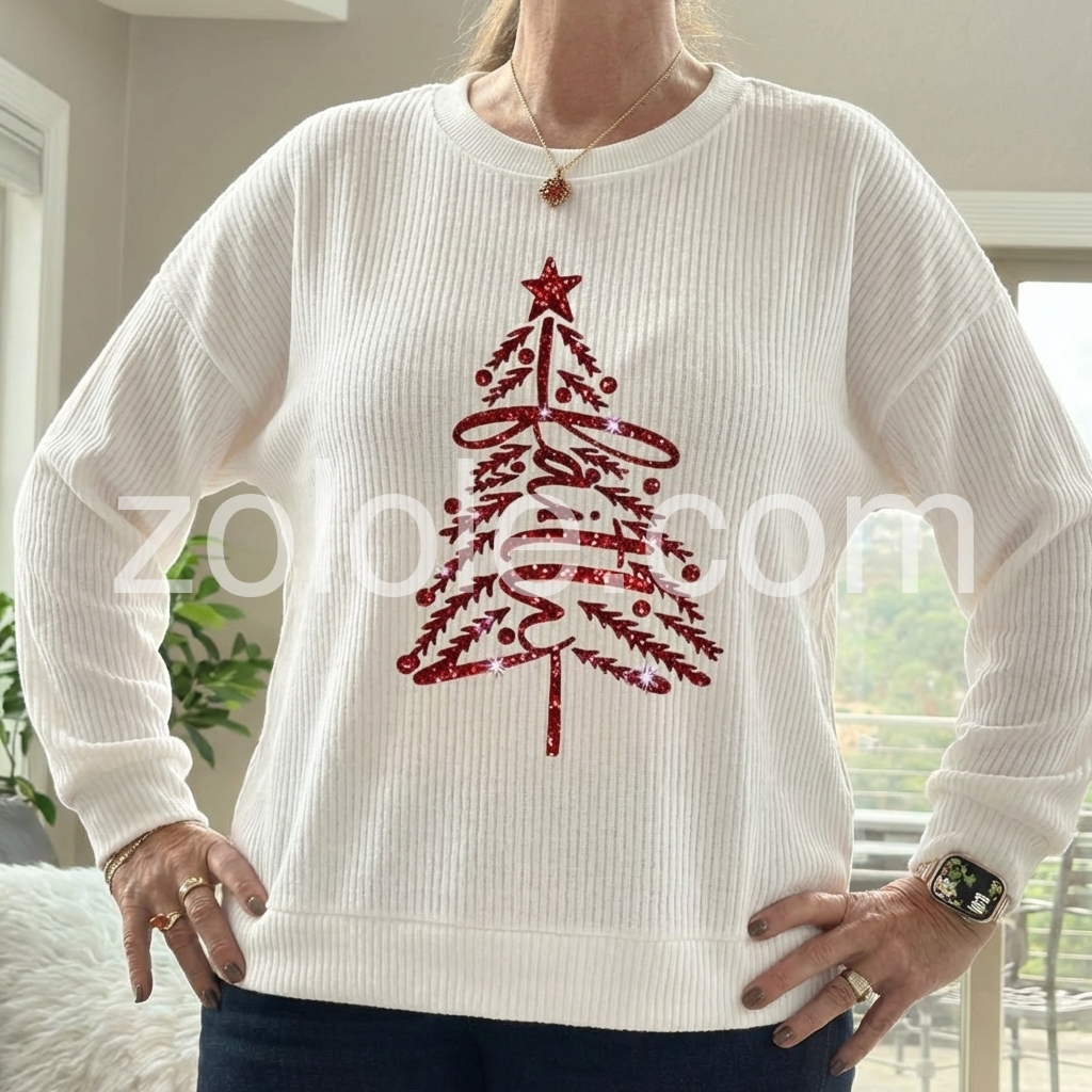Sparkly Red Christmas Tree Print Round Neck Top