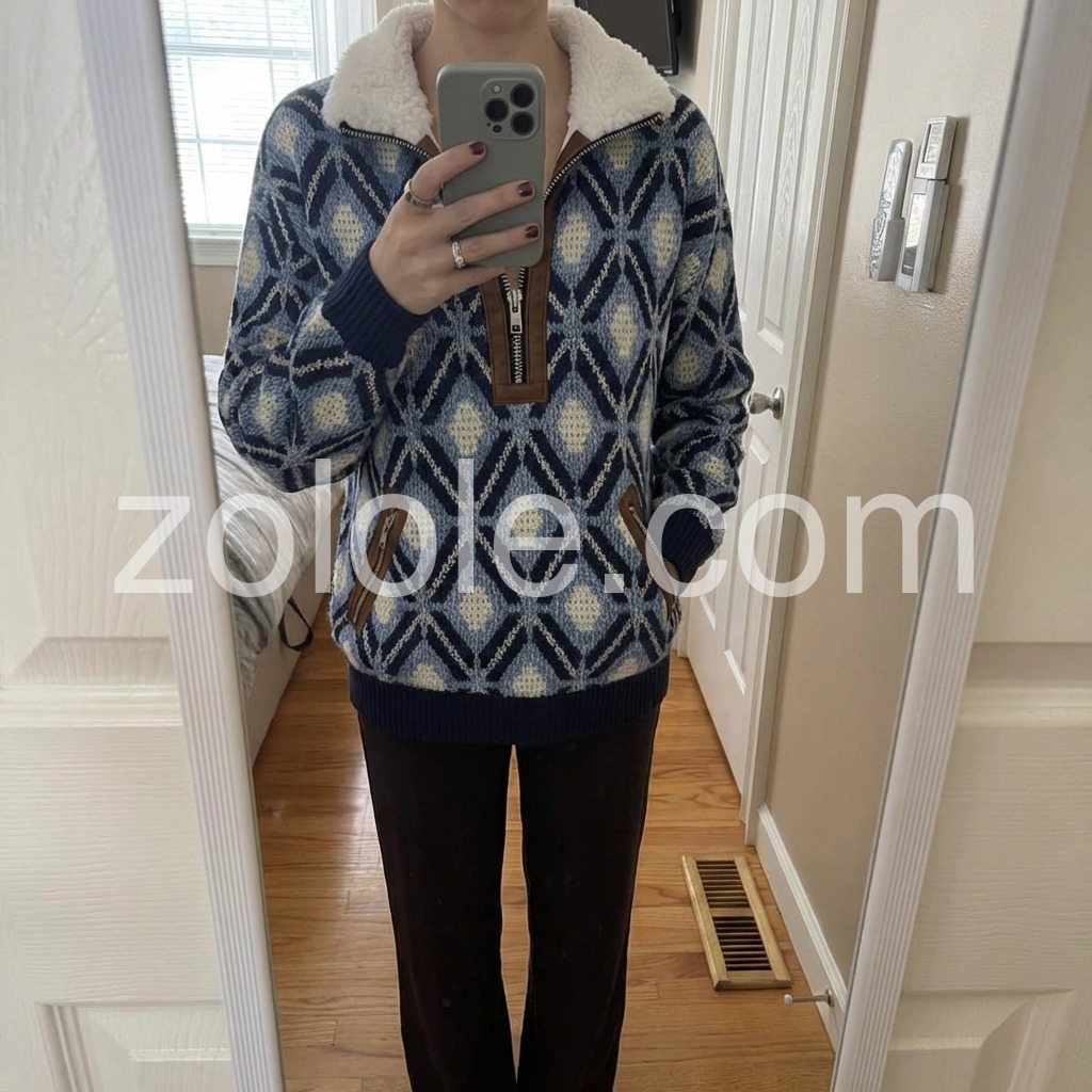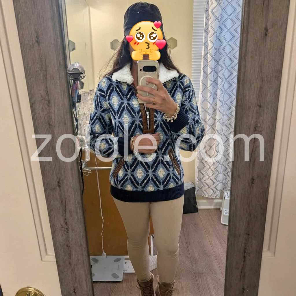 Blue Geometric Pattern Fleece Lined Knit Sweater